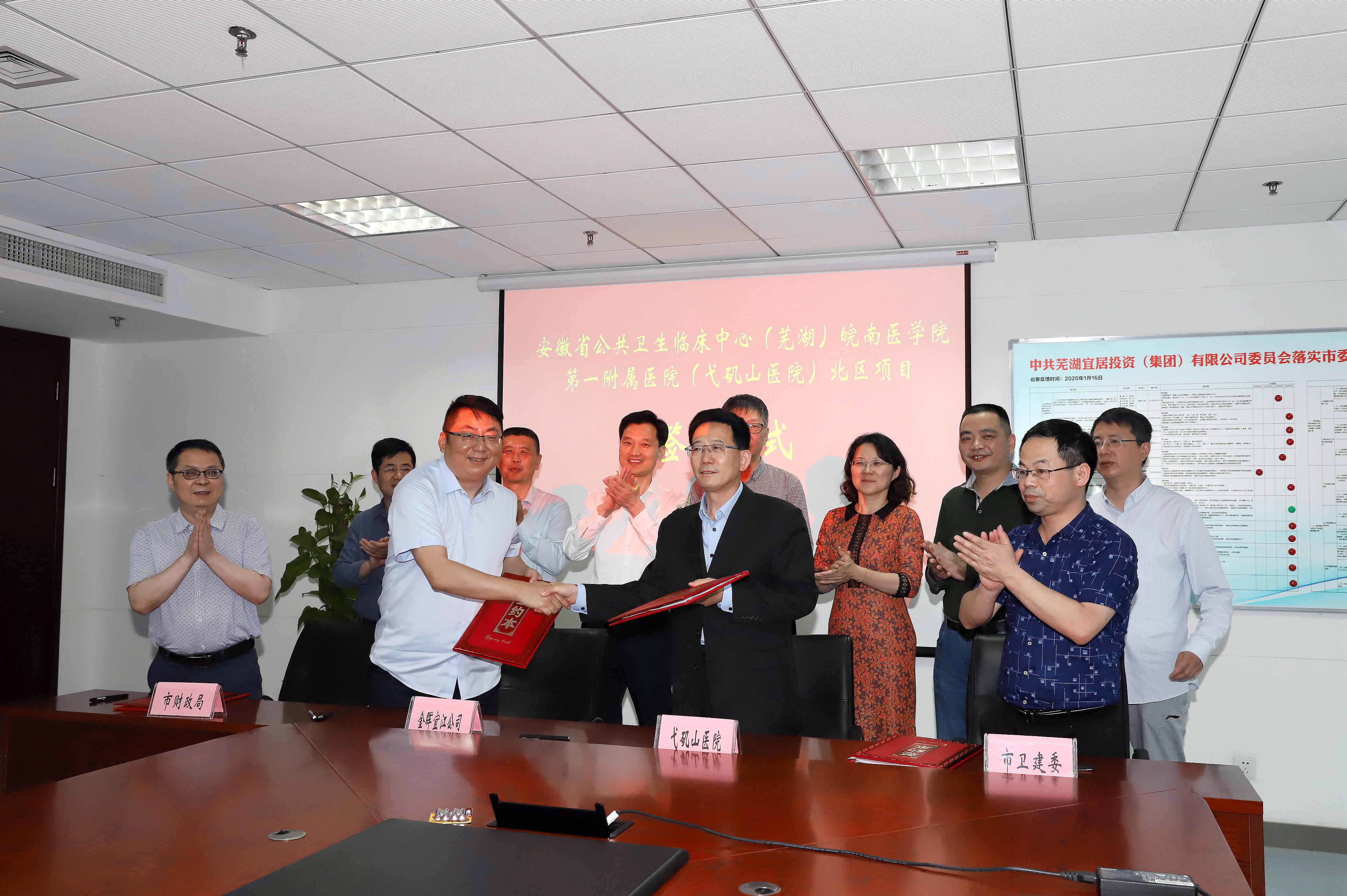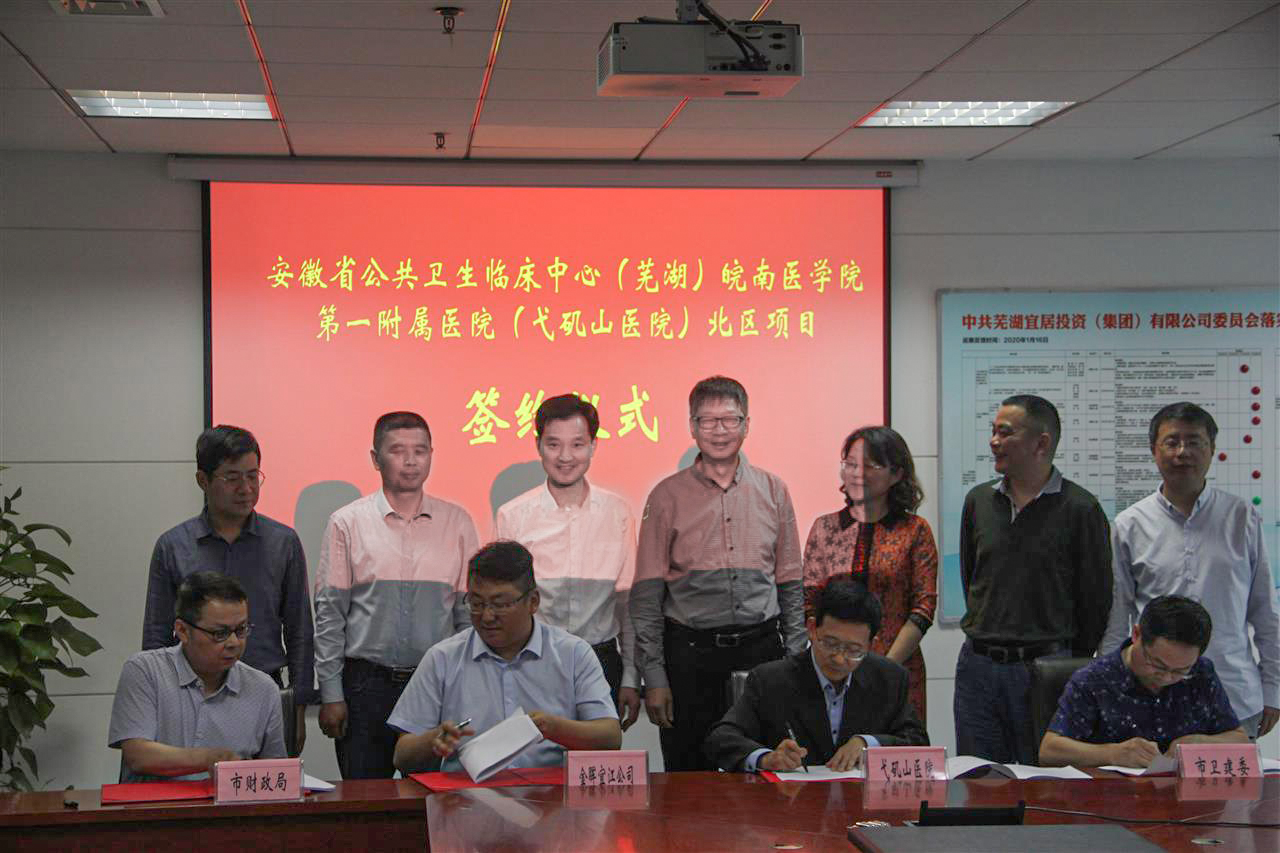 2021年5月26日,安徽省公共衛(wèi)生臨床中心(蕪湖)皖南醫(yī)學院第一附屬醫(yī)院(弋磯山醫(yī)院)北區(qū)項目合作協(xié)議簽約儀式在我司隆重舉行。弋磯山醫(yī)院黨委書記陳斌、院長朱向明、副院長凌江文、總會計師王良明、事業(yè)發(fā)展部主任黃鶴,市財政局副局長陳軍、債務辦主任范宗豹,市衛(wèi)健委黨委委員、副主任沈建軍,市宜居公司黨委書記、董事長沈世躍、副總經(jīng)理張黎麗,金暉宜江公司總經(jīng)理后宗斌出席簽約儀式。