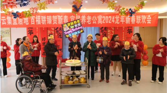 聯(lián)歡會在長者的非洲鼓表演中熱烈開場,蒙古舞熱情奔放,時裝走秀將活動氛圍引至高潮。養(yǎng)老公寓各社團的老師們早在一個月前便與長者們商量策劃活動節(jié)目,長者們躍躍欲試、勤加練習,摩拳擦掌要在聯(lián)歡會上一展所學。公寓98歲的金奶奶親自作歌詞一首“我在羅蘭小鎮(zhèn)等著你,這里的鳥兒會唱歌,我在養(yǎng)老公寓歡迎你”。92歲的羅奶奶參加了公寓多個社團,上臺表演了4個節(jié)目,來到宜居養(yǎng)老公寓后精神矍鑠、心情愉悅,“以前和家人有代溝,來到公寓和同齡人更有共同語言,公寓里經(jīng)常組織各種活動,不僅不再孤單寂寞,還豐富了我的文娛生活。”表演環(huán)節(jié)結(jié)束后,五心暉映先鋒志愿者為本月過生日的壽星送上生日蛋糕,壽星們與志愿者一起唱生日歌,收獲了滿滿的生日祝福。