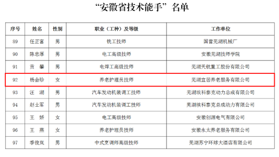 近日,從安徽省人力資源和社會保障廳傳來重磅喜訊,根據(jù)《關(guān)于表彰第十五屆全省高技能人才的決定》,蕪湖宜居養(yǎng)老服務(wù)有限公司濱江·養(yǎng)老公寓院長楊會珍同志榮獲“安徽省技術(shù)能手”稱號,成為蕪湖地區(qū)優(yōu)秀技能人才的杰出代表之一。