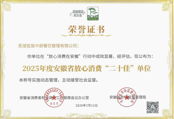 近日,2025年度安徽省放心消費“二十佳”基礎單元名單公布。蕪湖宜居中廚餐飲管理有限公司憑借其在消費者權益保護、誠信經(jīng)營和優(yōu)質(zhì)服務領域的突出表現(xiàn),歷經(jīng)區(qū)級申報、市級培育、省級評比,最終脫穎而出并成功入選,成為本年度蕪湖市唯一獲此省級榮譽的企業(yè)。